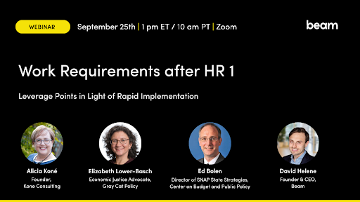 Join us on September 25th alongside guest panelists Alicia Koné, Elizabeth Lower-Basch, and Ed Bolen as we explore how states and counties can use innovative strategies to mitigate the impact of this new legislation. We’ll also share solutions to minimize administrative burden and keep eligible people from losing vital support.